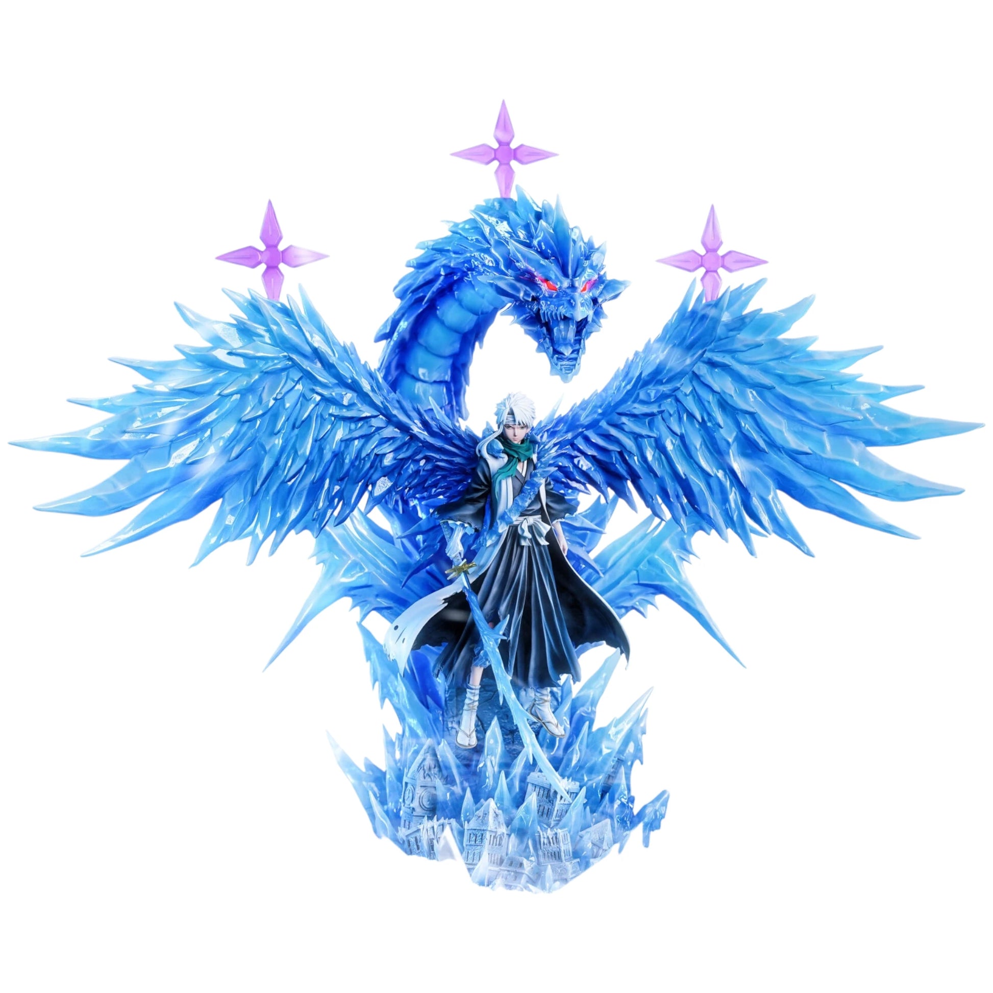 Inspirada en su aparición durante la Guerra Sangrienta de los Mil Años, esta pieza muestra a Hitsugaya en su forma Bankai Daiguren Hyorinmaru hollowficado, una representación majestuosa que combina fuerza, elegancia y una atención al detalle inigualable.