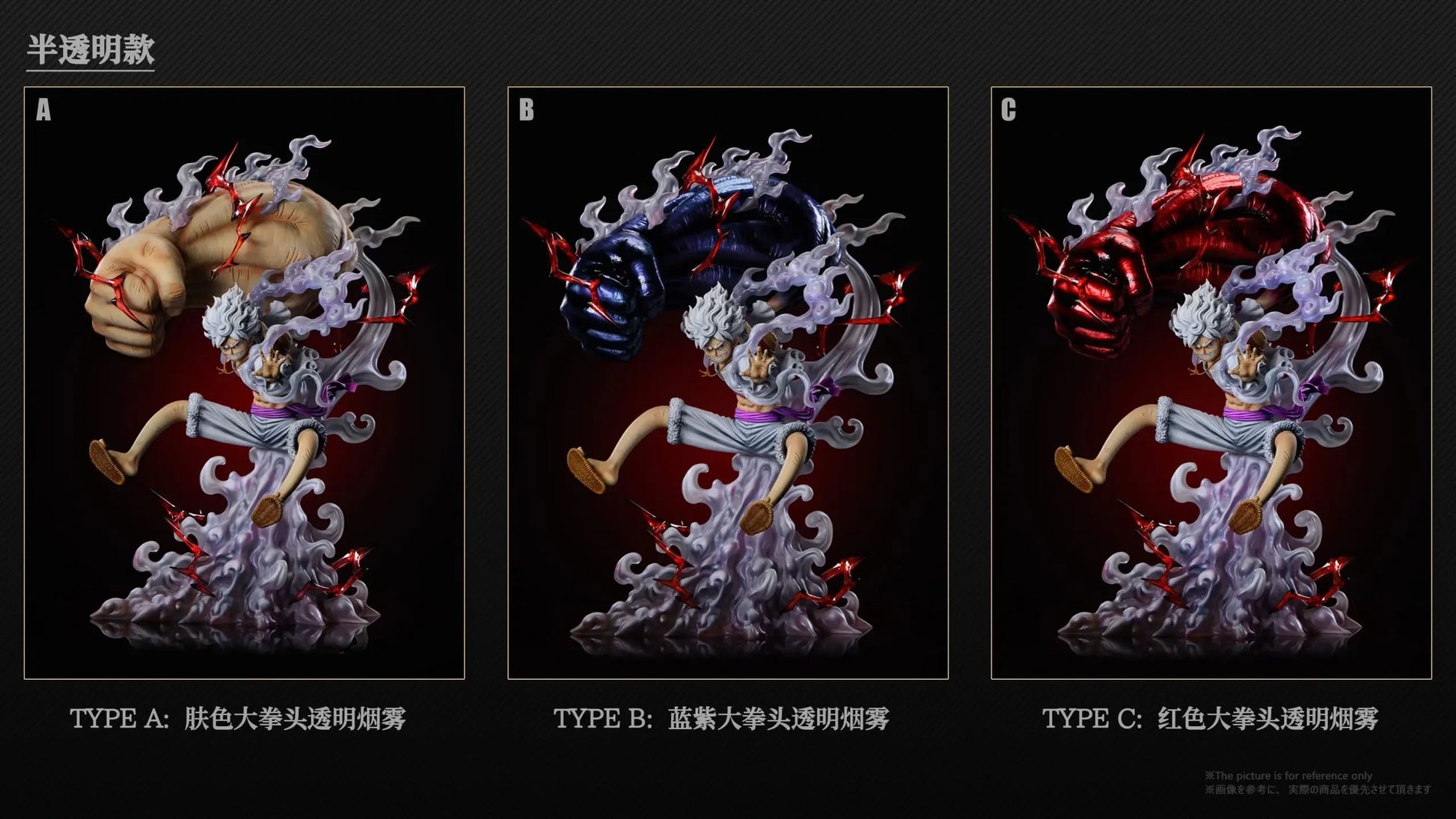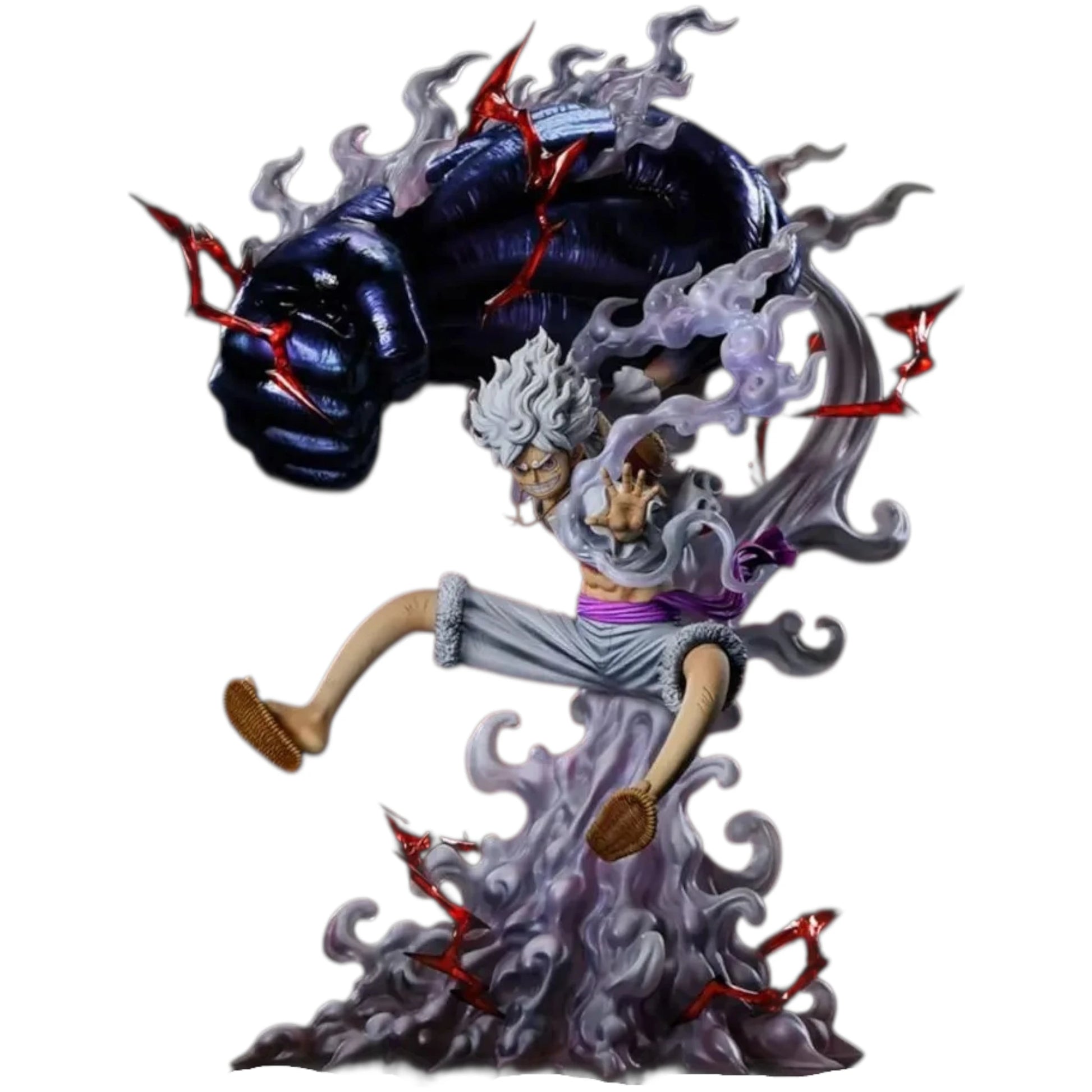 Base dinámica: La base reproduce un efecto de humo con rayos de haki, simbolizando el poder incontenible del Gear Fifth.