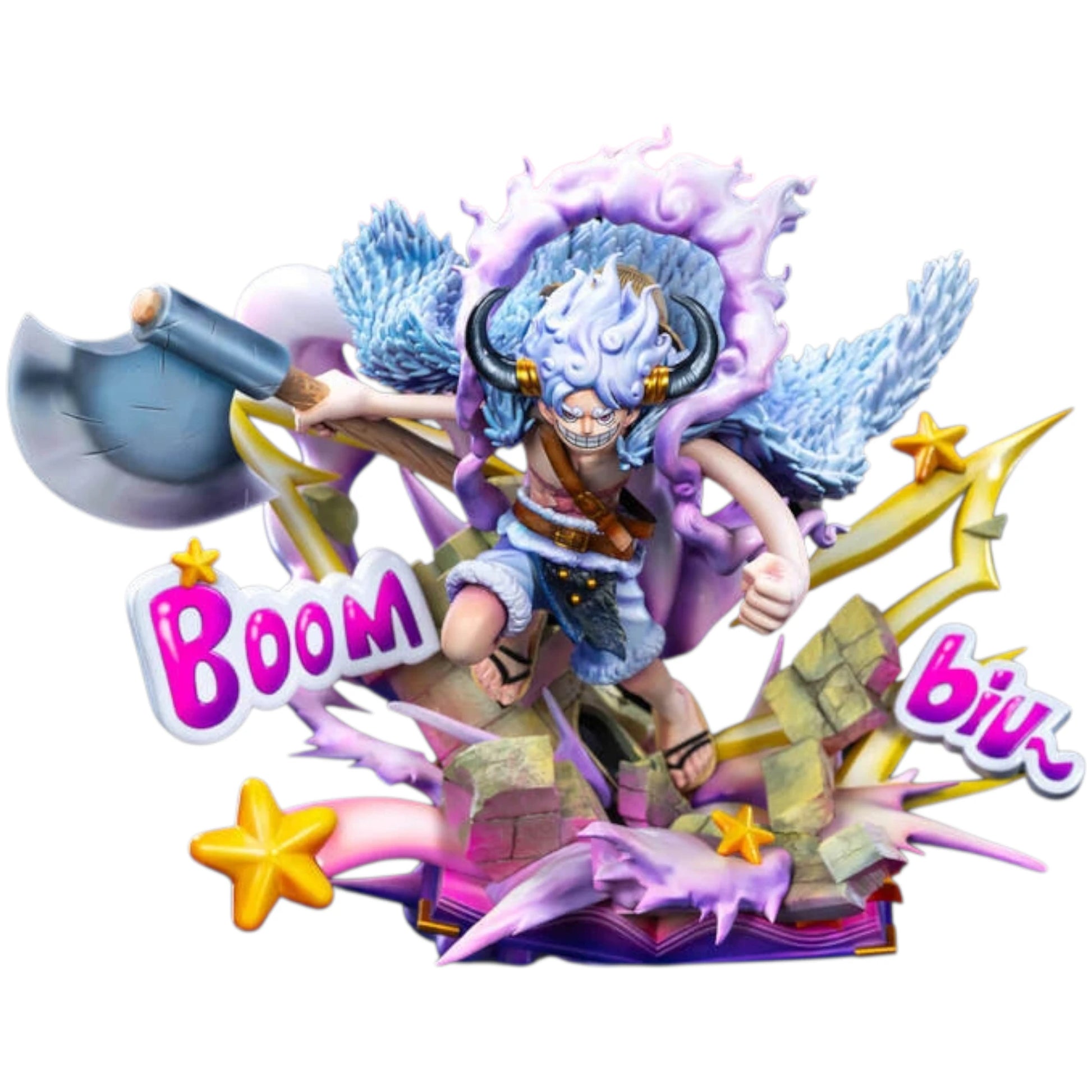 Diseño detallado y dinámico: Luffy sostiene un hacha en su mano derecha, mientras lleva un casco adornado con cuernos y una capa ondeante en la espalda, proyectando la imagen de un auténtico guerrero gigante.