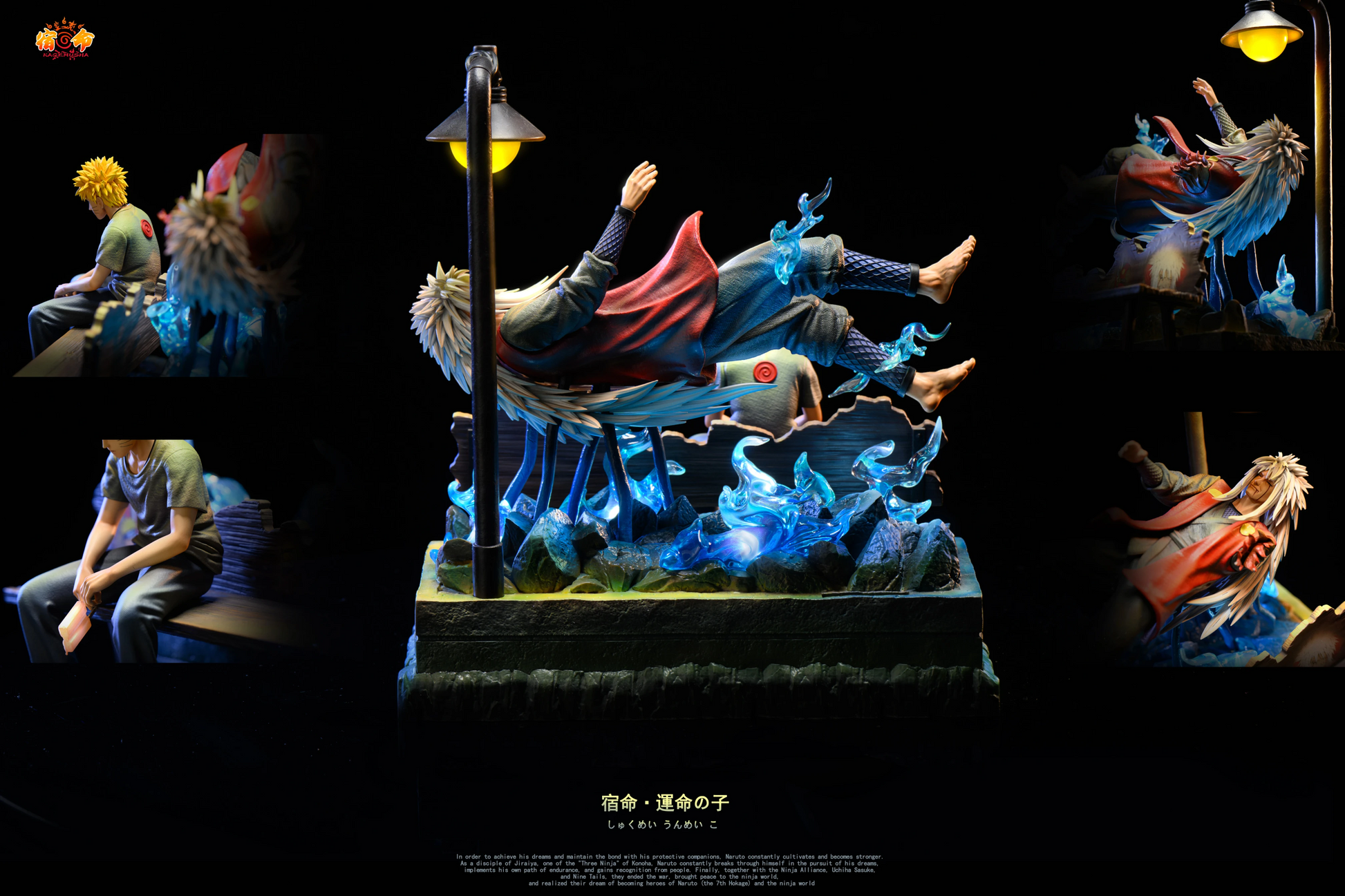 Banca con grabados conmemorativos: Incluye relieves que representan momentos clave entre Jiraiya y Naruto, así como el fallecimiento del legendario sannin.